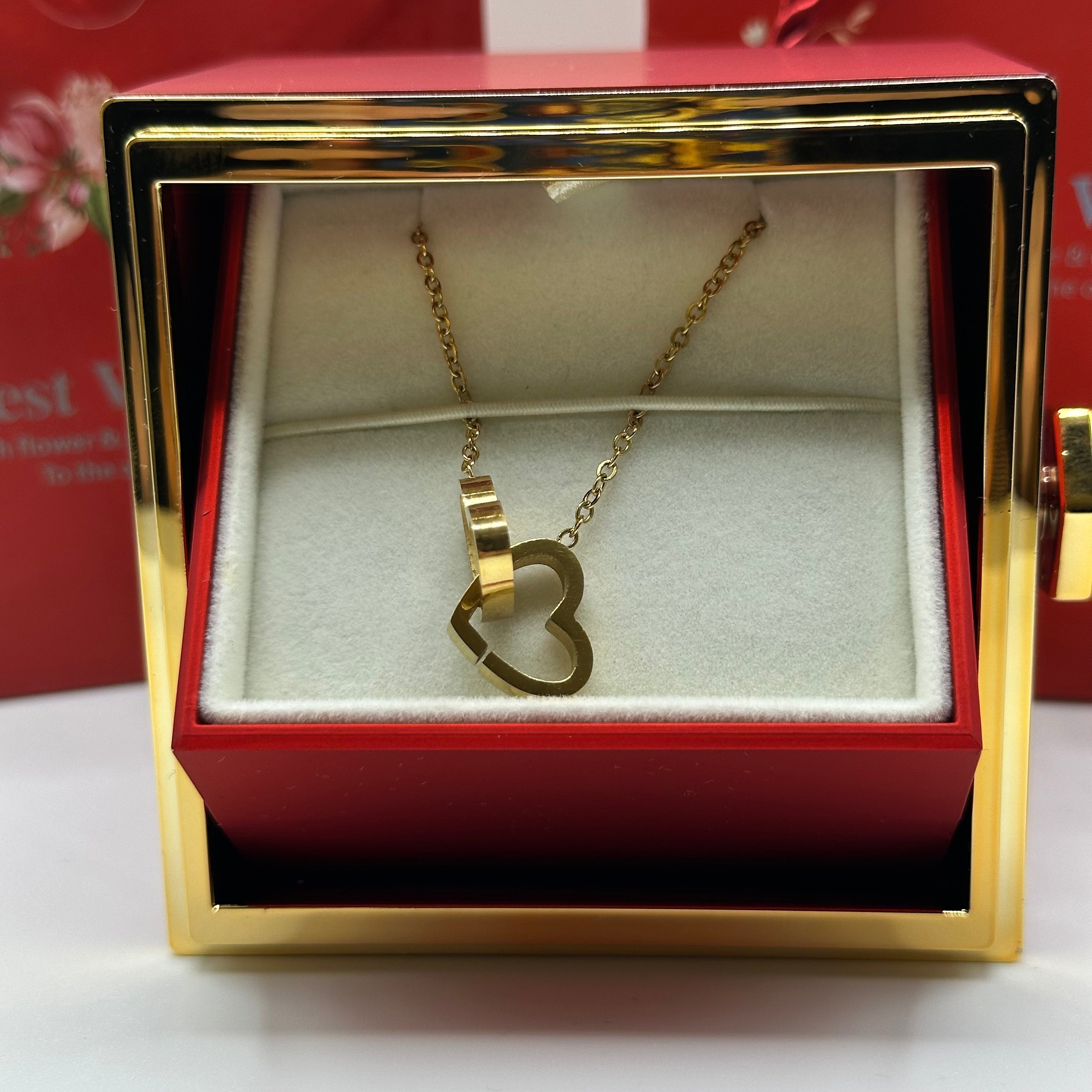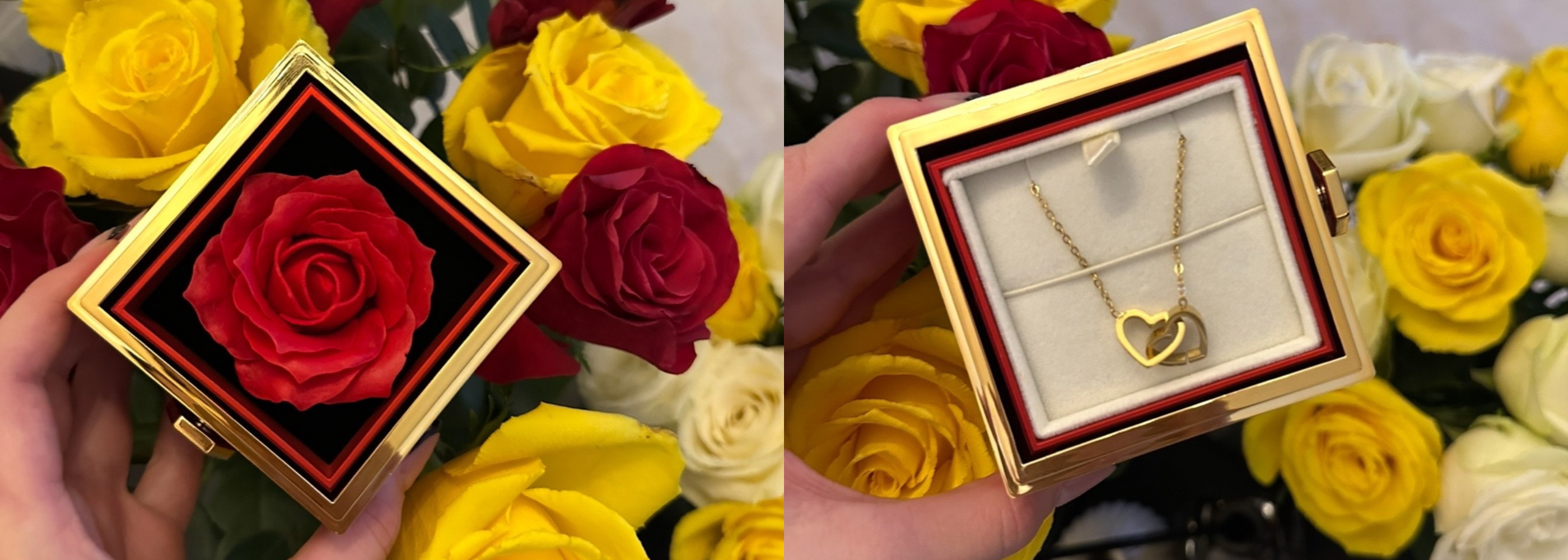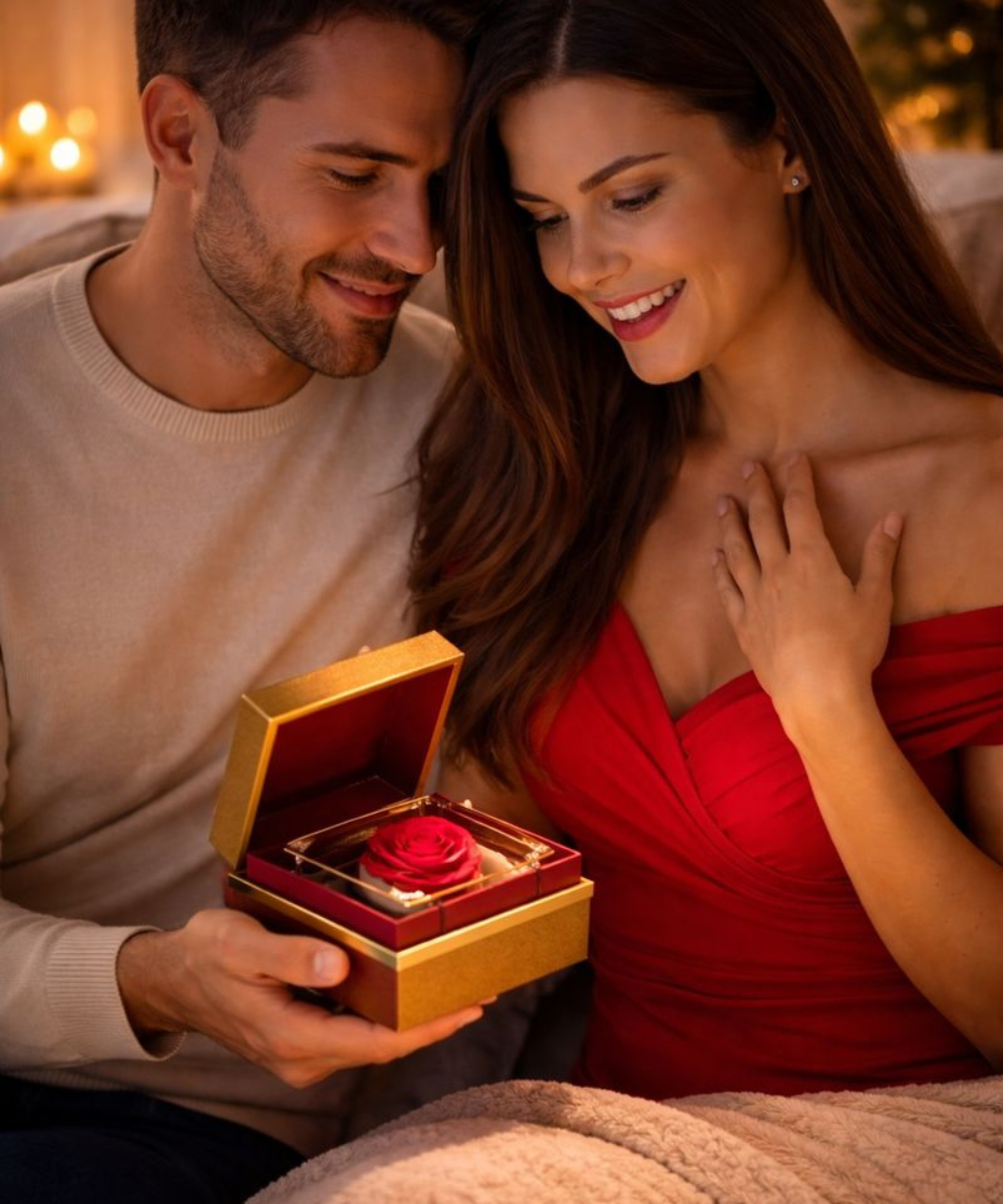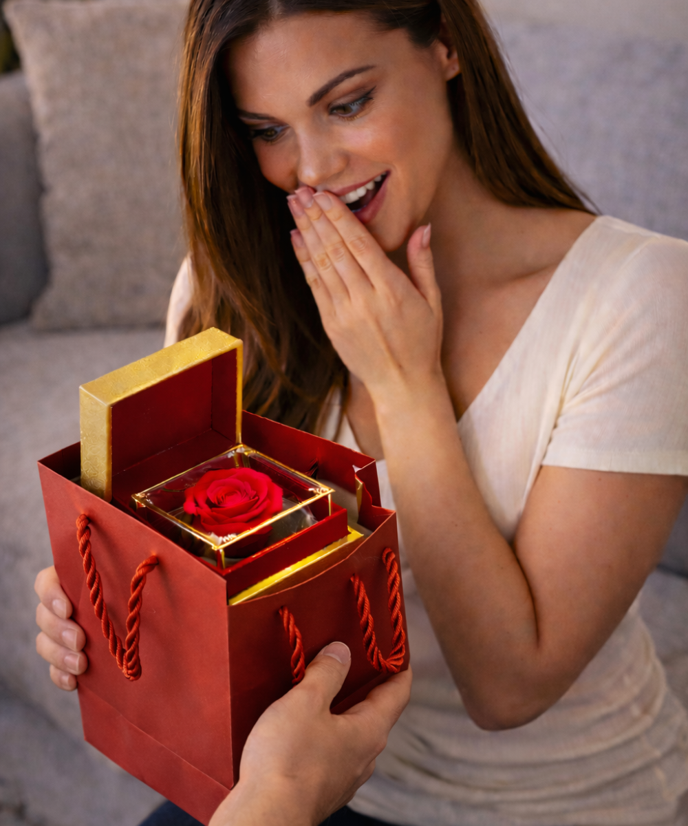 Elle découvre une rose qui ne fane jamais, accompagnée d’un collier pensé pour elle.